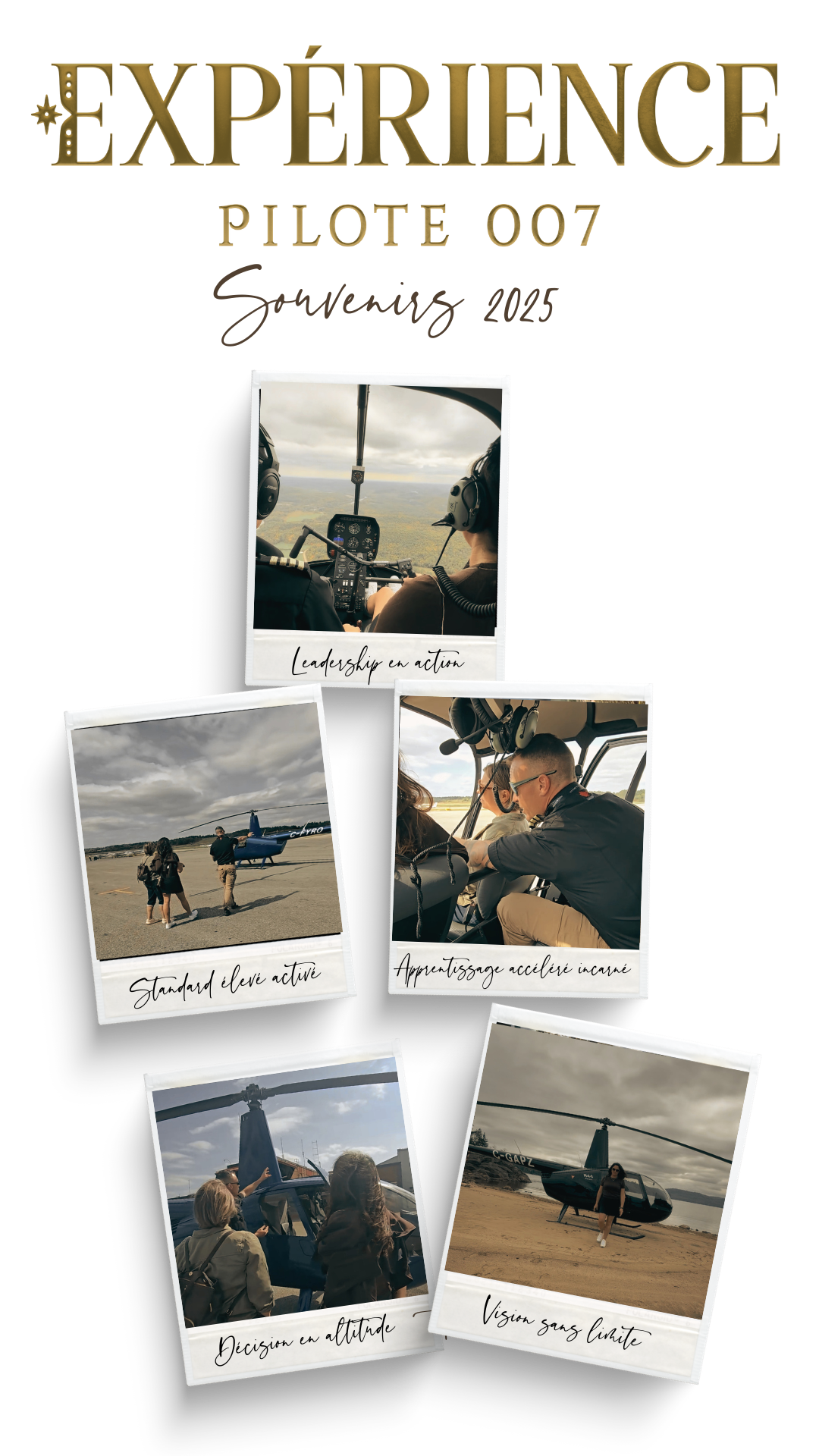 Ancrage : En quelques heures, tu vas apprendre à piloter un hélicoptère… pour constater que tu peux apprendre, décider et agir beaucoup plus rapidement que ce que tu aurais pu croire… Expansion de capacité et leadership incarné.
